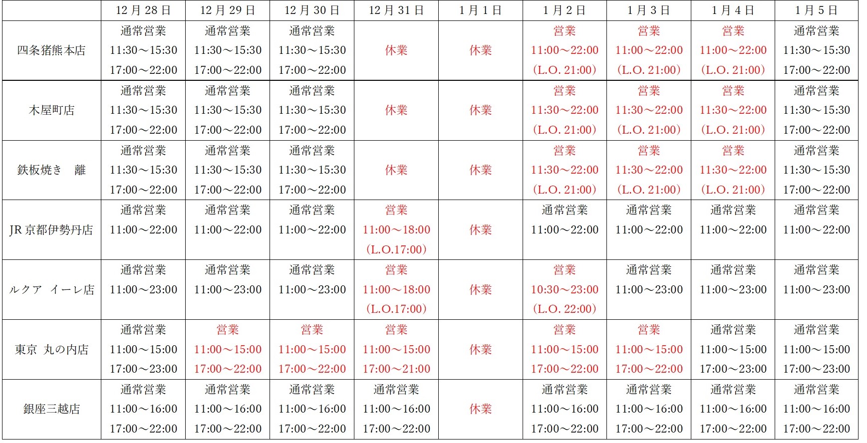 ◆東京丸の内店・銀座三越店の変更はございません。