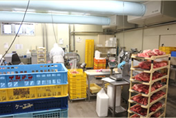 隣接する京都食肉市場で競り落とした牛・豚をはじめ、鮮度が厳密に保たれた状態で入荷される枝肉を、熟練職人の技術、最新の管理システムの下で部分肉へとカット処理しています。