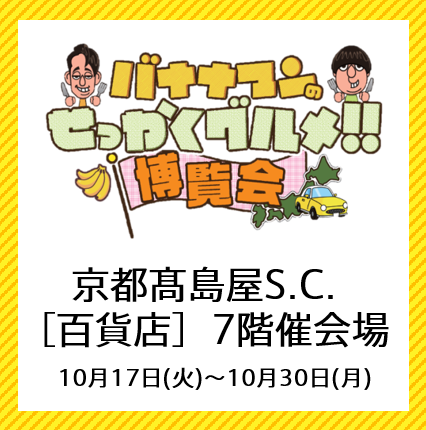 京都高島屋S.C[百貨店]7階催会場にて開催される「バナナマンのせっかくグルメ!!博覧会」に、前半日程の10月17日(火)→23日(月)に出店いたします。 看板料理の「すき焼き」を高島屋限定のお弁当にしてご提供いたします。 ▼詳しくはこちら https://www.takashimaya.co.jp/kyoto/bananaman_gourmet/index.html